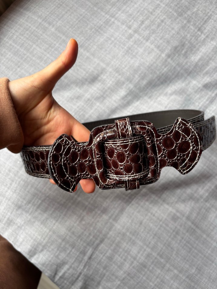Kahverengi deri, tokalı, Paris ve bohem tarzını yansıtan kadın kemeri. Retro ve hippie stiller için uygun. Hiç kullanılmadı