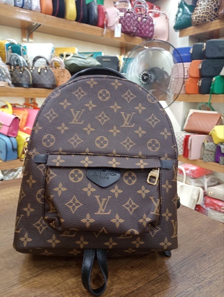 Kahverengi deri tokalı sırt çantası, desenli ve günlük kullanım için uygun, klasik Paris sokak modası tarzında.