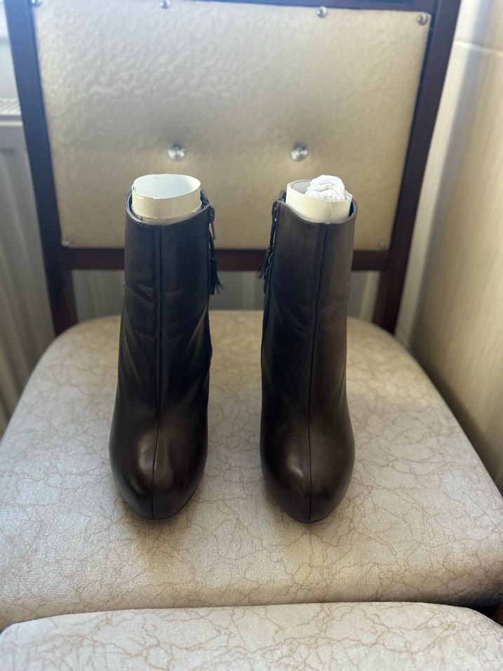 Kahverengi deri, tokalı, stiletto topuklu kadın bot. Minimalist ve çağdaş tasarıma sahip, ofis kullanımı için uygun. Sadece evde bir kez giyildi sıfır herhangi bir defosu yok topuk boyu 12 santim içten platformlu o yüzden ayağı rahatsız etmiyor 40 numara kahverengi suni deri arkasında kahverengi deriden ve tüyden yapılmış çok tarz bir detayı var çok hoş çok tarz bir bot kaçırmayın derim #tarz#
