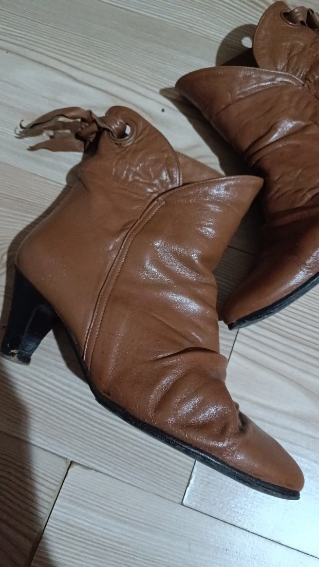 Parlak kahverengi deri, blok topuklu kadın botu, bohem tarzıyla günlük kullanıma uygun. atış yüzeyi gerçek deridir ancak beklemeden dolayı iç kısımda dökülmeler oldu. Hiç kızma temizletilip kullanılabilir Benim ayağım şu an küçük geldiği için kullanamıyorum. sorun olmaz diyen için fiyatı uygun tutuyorum.