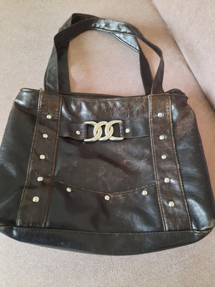 Koyu kahverengi deri tokalı, vintage gotik tarzda kadın çantası. Günlük kullanım için uygun, baskılı desen ve metal perçin detayları bulunur.