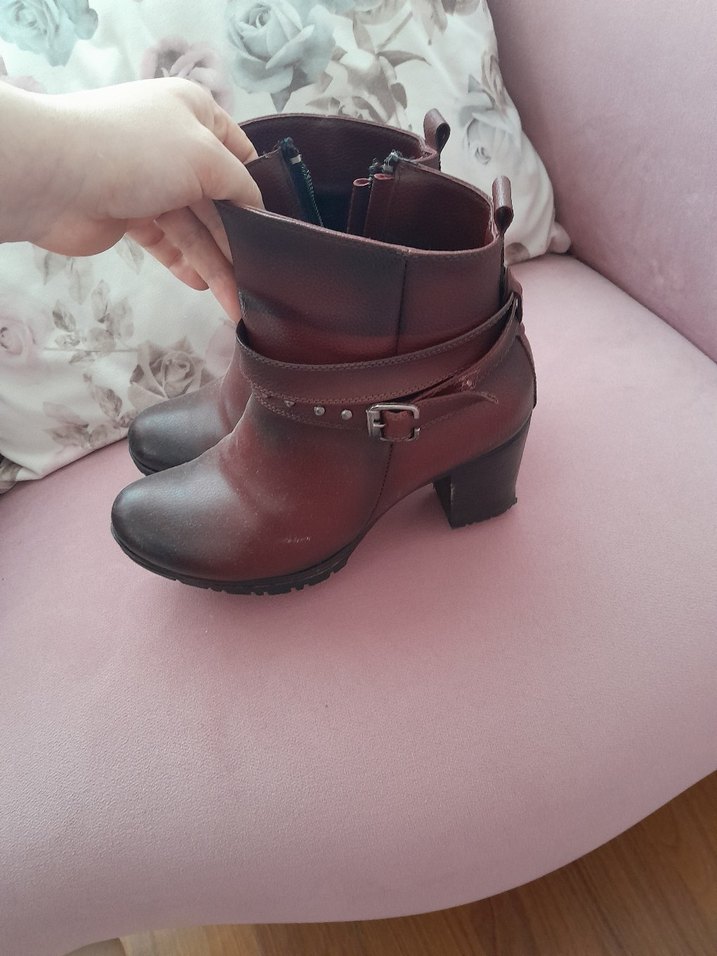 Kahverengi deri biker botlar yüksek topuklu ve tokalı kayışlara sahiptir. Rahat ve desen içermeyen koyu tasarımıyla günlük kullanıma uygundur.