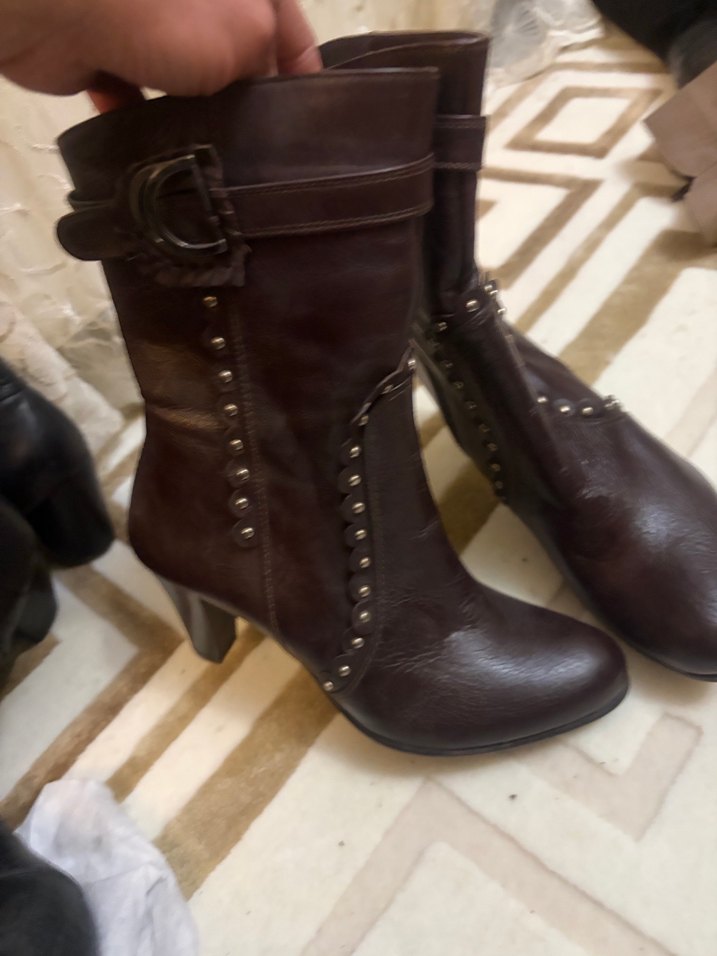 Kahverengi deri, tokalı ve yüksek topuklu kadın çizmesi, desenli ve perçin detaylı, vintage goth tarzında.Hiç giyilmedi geçen kış alındı.