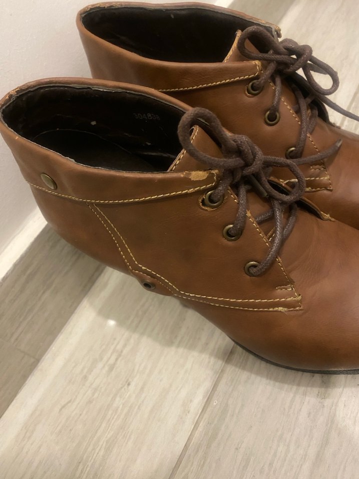 Kahverengi deri, topuklu kadın bot. Minik soyulmaları mevcut çatlaması yok uygun fiyat tam kalıp.