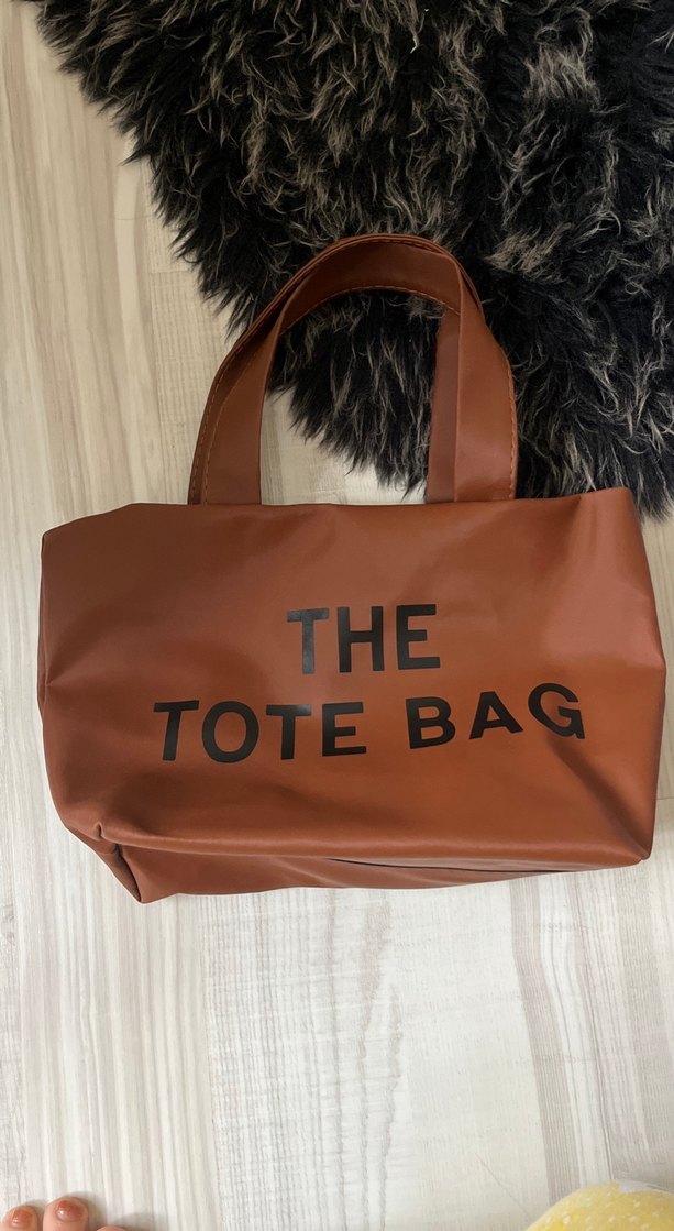 Kahverengi deri, kürklü detaylı ve baskılı yazılı tote çanta. Sağlam sapları ve koyu renk tonuyla sokak modasına uygun.