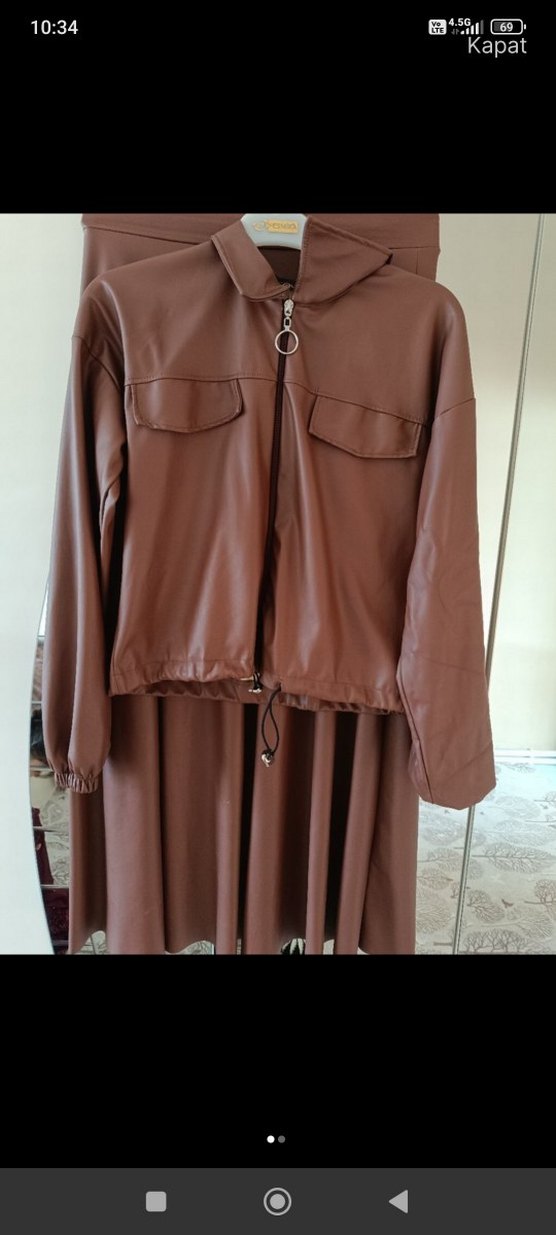 Kahverengi deri, uzun kesim, bol kesim kadın takımı. Uzun kollu, kesik yaka ve kemerli, sokak tarzında, günlük kullanım için uygun.
