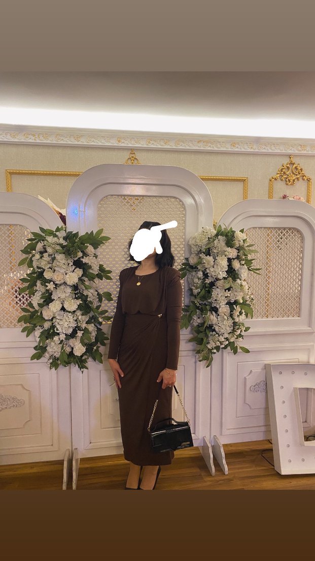 Kahverengi deri, uzun kollu, drapeli ve yüksek yakalı dar kesim elbise. Klasik ve zarif ofis şıklığı için ideal. Bir kez giyildi bir sıkıntısı yoktur