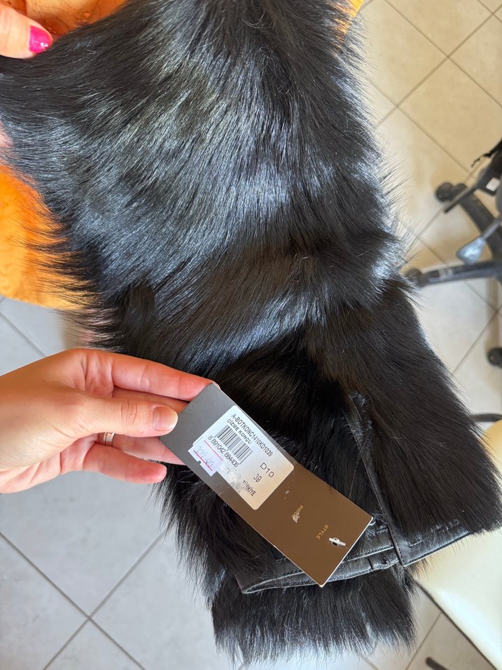 Kahverengi deri ve koyu renk kürk detaylı, normal uzunlukta, strappy kollu, notched lapel yakalı, baskılı ve fitted kesim midi ceket. Avant-garde tarz için uygun.