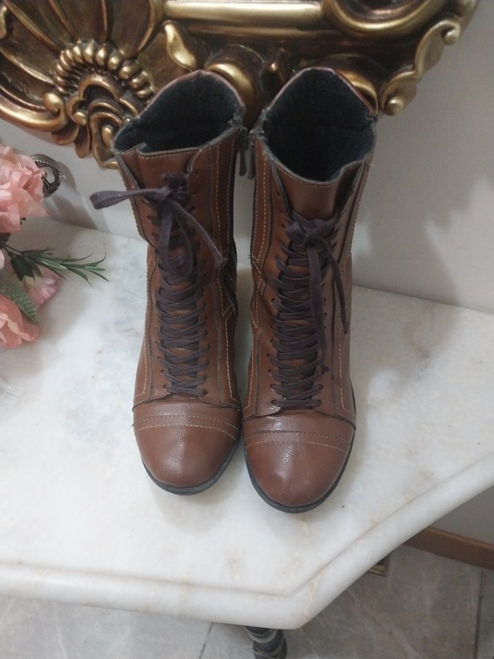 Koyu kahverengi deri kadın botları, dolgu topuklu, bağcıklı ve tokalı detaylara sahip vintage tarzda. Günlük kullanıma uygun. Ic astarinda ufak bir kalkma var.Degisince duzelir.Fiyati uygun tutuyorum