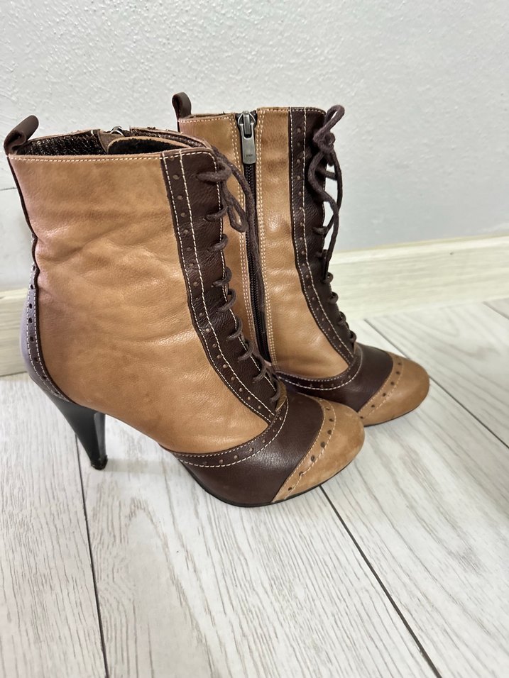 Kahverengi deri, bağcıklı ve tokalı, vintage bohem tarzda, ofis kullanımı için uygun topuklu botlar.