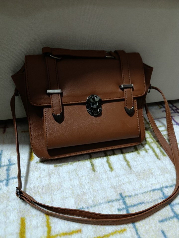 Parlak kahverengi deri, vintage tarzında tokalı kayışlara sahip kadın çantası. Minimalist tasarım, günlük kullanım için uygun, trend casual stil. evi boyatırken birkaç damla boya sıçramış. taban kısmında olduğu için göze çarpmıyor