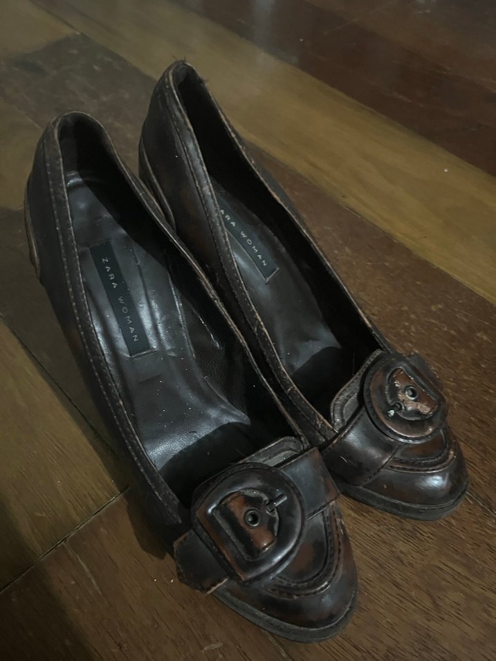Kahverengi deri ve eskitme detayli topuklu ayakkabı