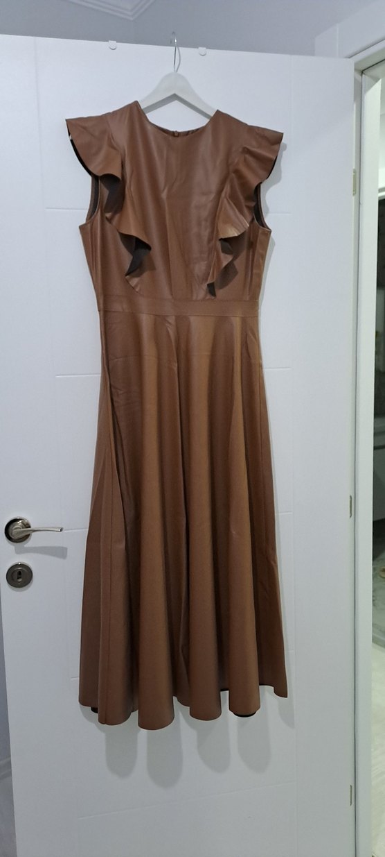 Kolsuz, V yaka, volan detaylı bej deri uzun elbise, ofis için şık ve çağdaş bir görünüm sunar. 1 kez kullanıldı