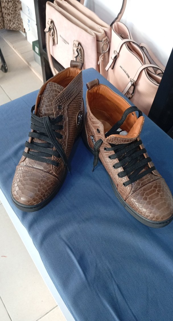 Kahverengi deri, yılan desenli ve siyah bağcıklı erkek spor ayakkabısı. Sokak stili ve günlük kullanım için uygun, rahat ve şık bir model.
