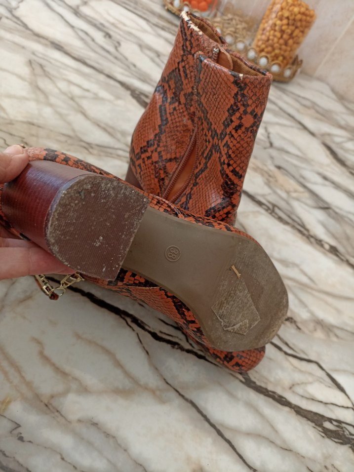 Kahverengi deri, koyu yılan desenli kadın botları. Bohem tarzda, tokalı ve blok topuklu, günlük kullanım için uygun. bazı yerlerinde soyulmalar var iyi inceleyin