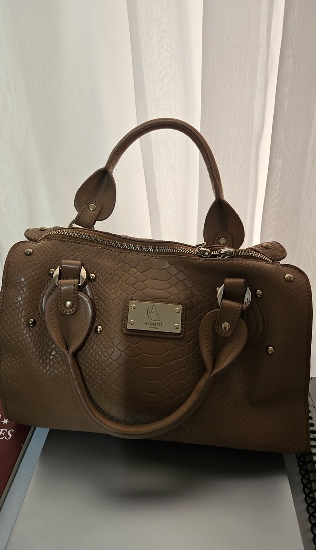 Kahverengi deri, yılan deseni ve tokalı detaylara sahip kadın çantası, klasik zarafeti çağdaş stil ile birleştirir.