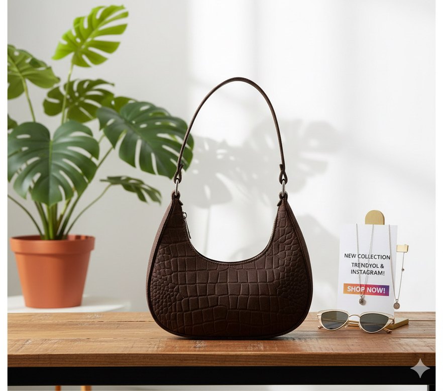 Bu kahverengi keçe ve kadifemsi dokuya sahip çanta, koyu yılan desenli minimalist ve trend sokak stili için uygundur. Ürün Zara muadilidir