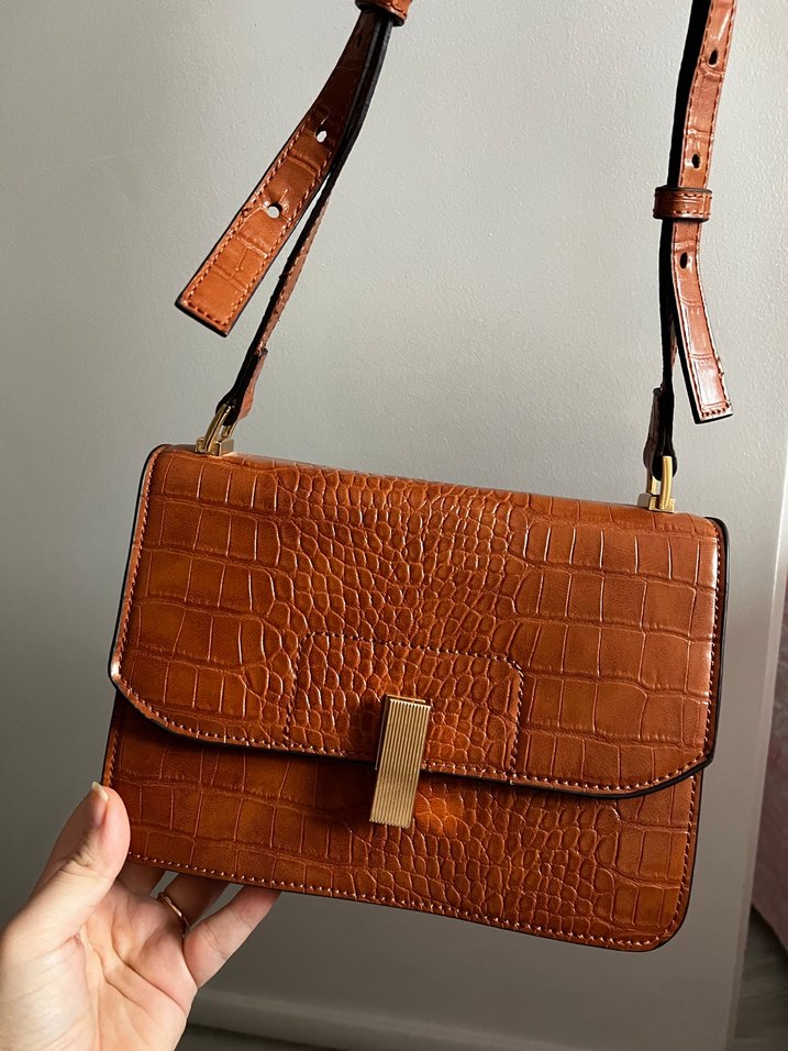 Kahverengi deri yılan desenli, tokalı kadın çanta. Günlük sokak stili için klasik ve şık tasarım.