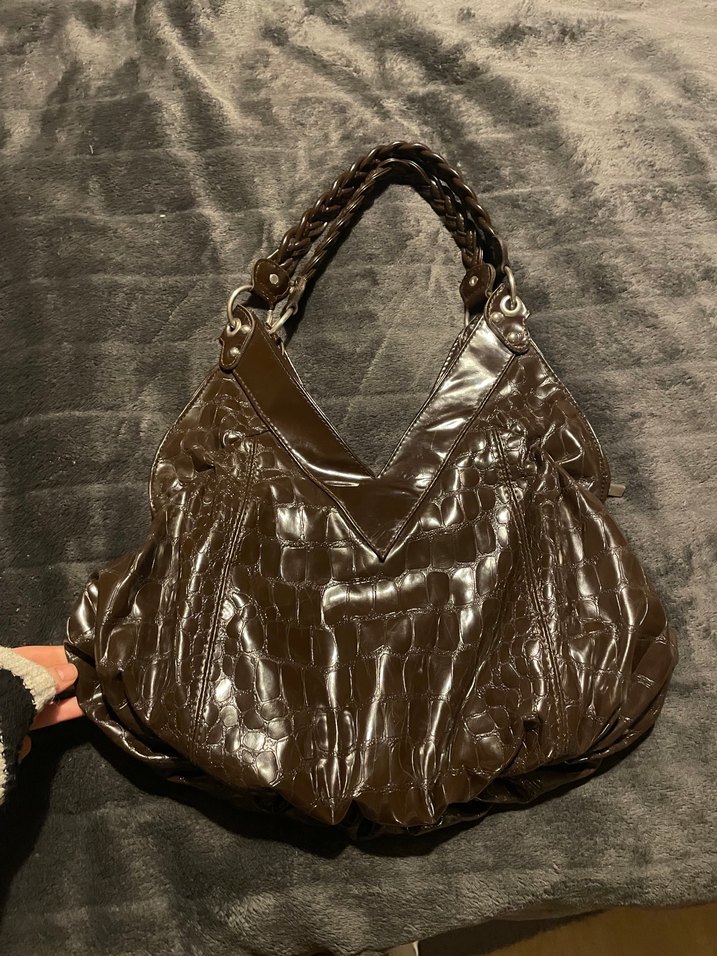 Koyu kahverengi deri yılan desenli, tokalı ve örgülü saplı şık goth tarzda kadın çantası. Orijinaldir. Amerikan vintage, amerikan retro çantadır