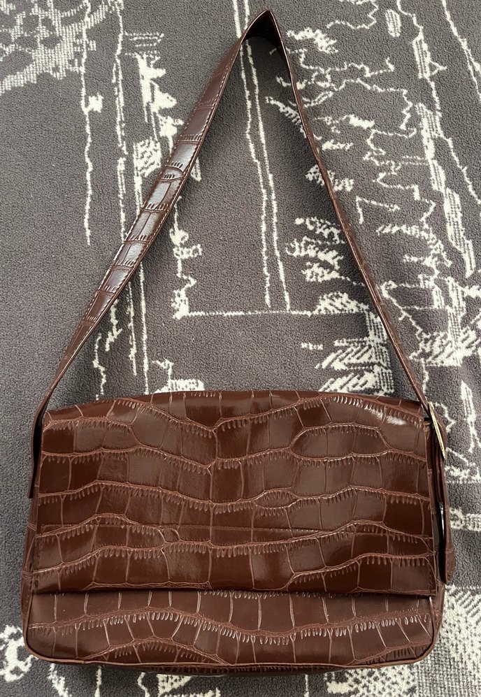 Koyu kahverengi deri, yılan desenli ve tokalı çanta. 2-3 kere anca kullandım.