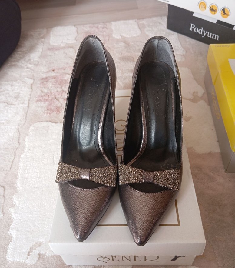 Parlak yılan desenli kahverengi deri stilettolar, tokalı ve yüksek topuklu. Düğünler için modern klasik ve göz alıcı şıklık sunar. Marka: Podyu.