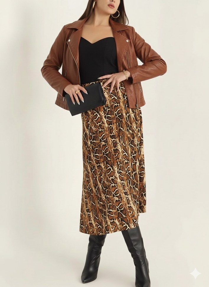 Kahverengi deri yılan desenli uzun etek, kemerli ve rahat kesimli. Sokak stiline uygun günlük kullanıma ideal.