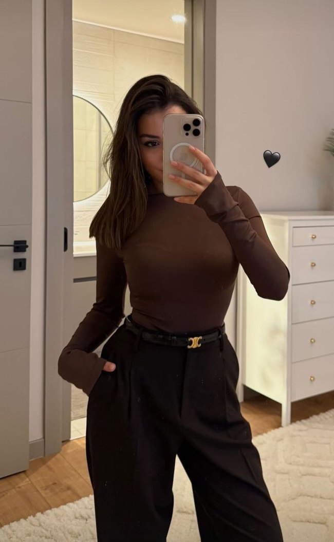 Kahverengi deri, uzun kollu ve yüksek yakalı, iş ve günlük kullanıma uygun, normcore tarzda şık bir bluz. Rahat kesimiyle gündelik şıklık sunar.