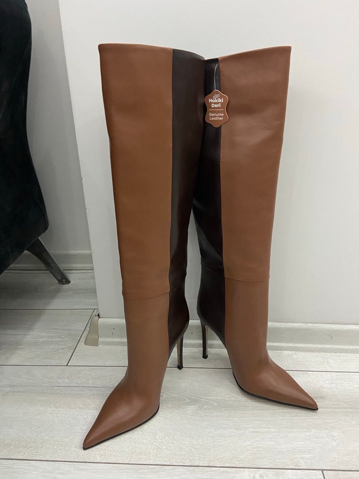 İnce topuklu, kahverengi deri çizme. Cesur ve klasik tarz için uygun. Hakiki deridir, içi sıcak tutar