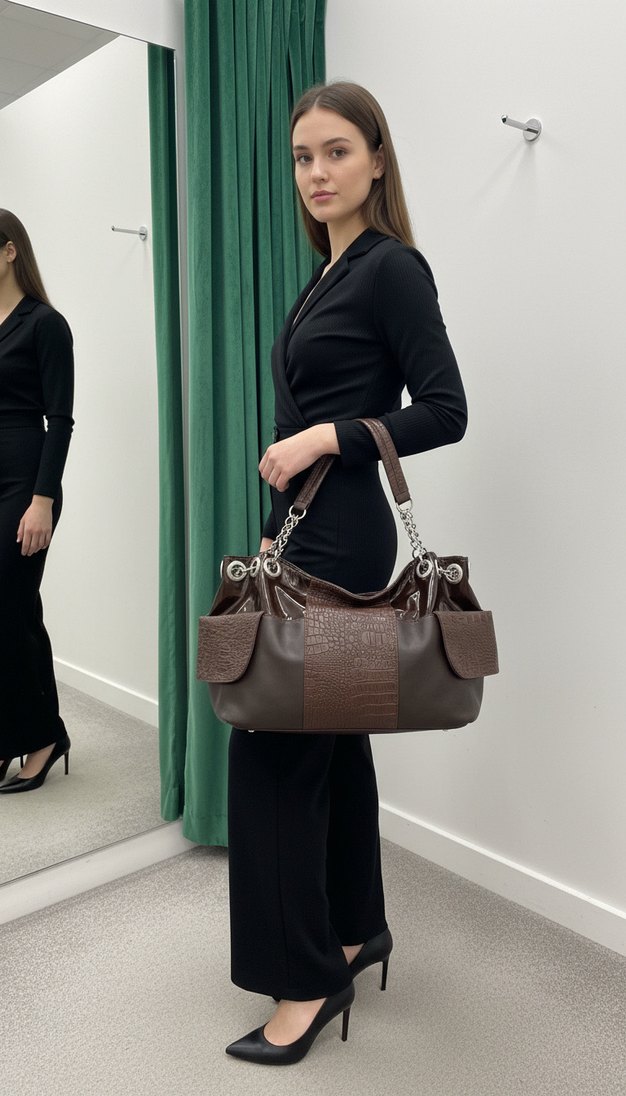Kahverengi deri, parlak yılan desenli ve zincir detaylı çanta, günlük kullanım için çağdaş Paris tarzını yansıtıyor.