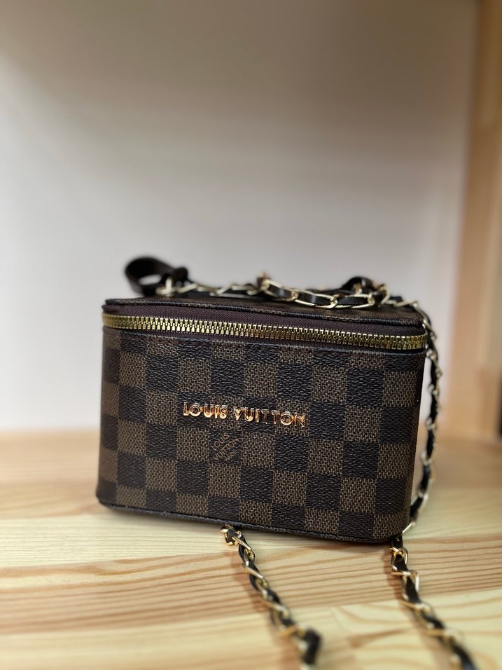 Koyu kahverengi deri çanta, kareli deseni ve zincir detaylarıyla klasik Paris sokak stilini yansıtıyor.