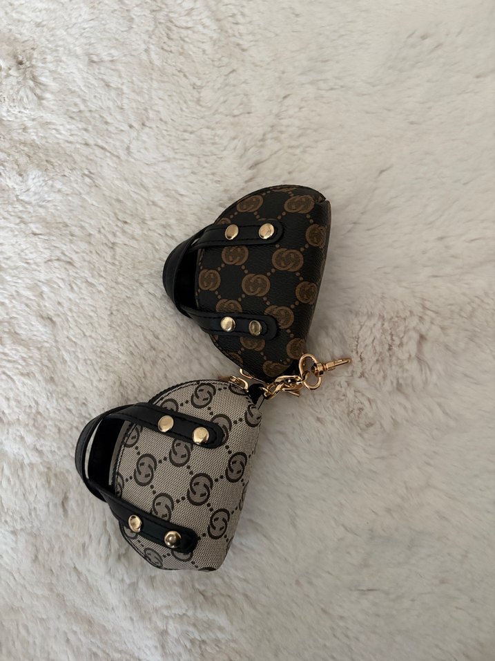Kahverengi desenli köpek aksesuarları, siyah kayışlar ve altın renkli anahtarlık bağlantısına sahip. Çanta aksesuarı