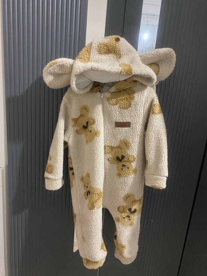 Pastel kahverengi, kürklü ve desenli kumaştan yapılmış, kapüşonlu ve kulak detaylı bebek erkek tulumu. Street wear tarzında rahat bir model.