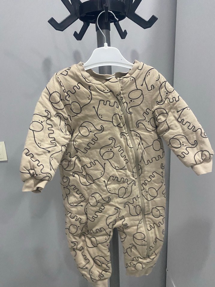 Kahverengi, desenli ve fermuarlı bebek tulumu. Yumuşak ve sıcak fleece kumaştan üretilmiştir.