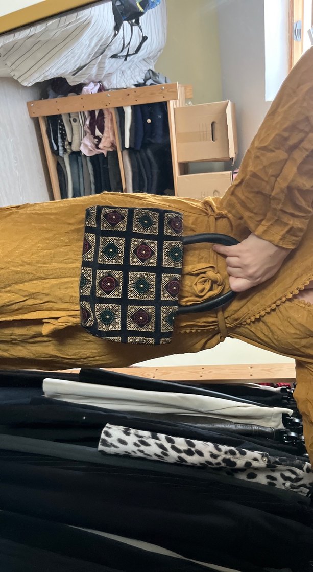 Kahverengi desenli tekstil malzemeden, tokalı ve saplı bohem kadın çantasıdır, günlük kullanıma uygundur.