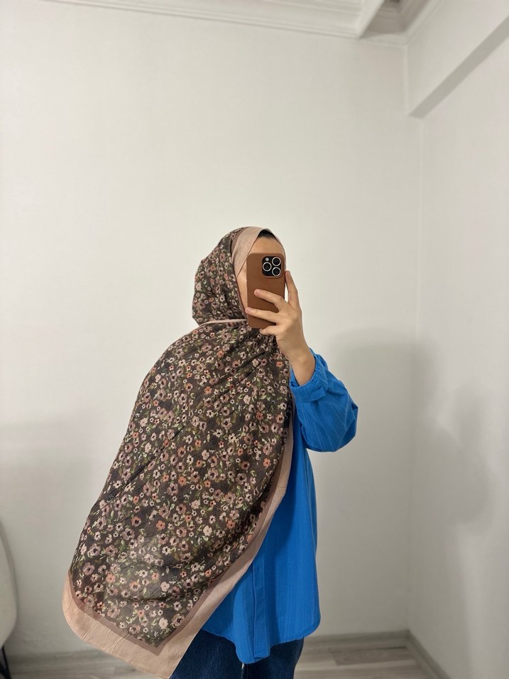 Koyu kahverengi, çiçek desenli kadın şalı, sentetik yumuşak kumaştan, bohem ve sade tarzlara uygun, drapeli modeldir.