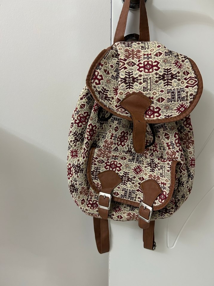 Kahverengi tokalı kayışlara sahip, desenli bohem tarzı sırt çantası, günlük kullanım için uygundur. Söküğü yırtığı yoktur