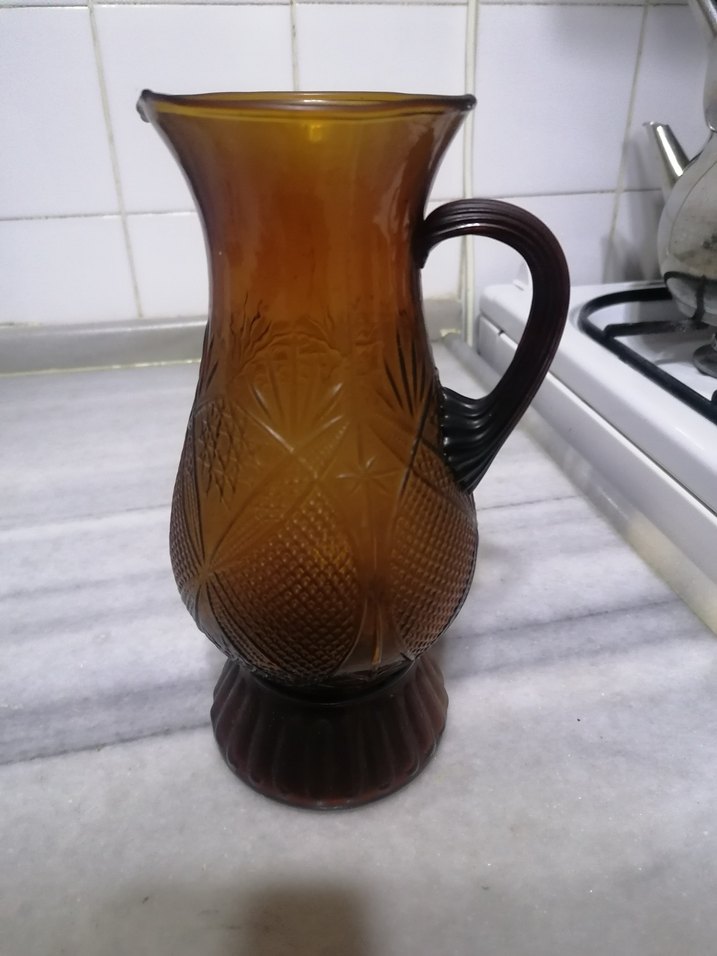 Desenli ve saplı koyu kahverengi cam sürahi, içecek servisinde kullanılabilir. Antika sürahi hiç bir sorunu yoktur
