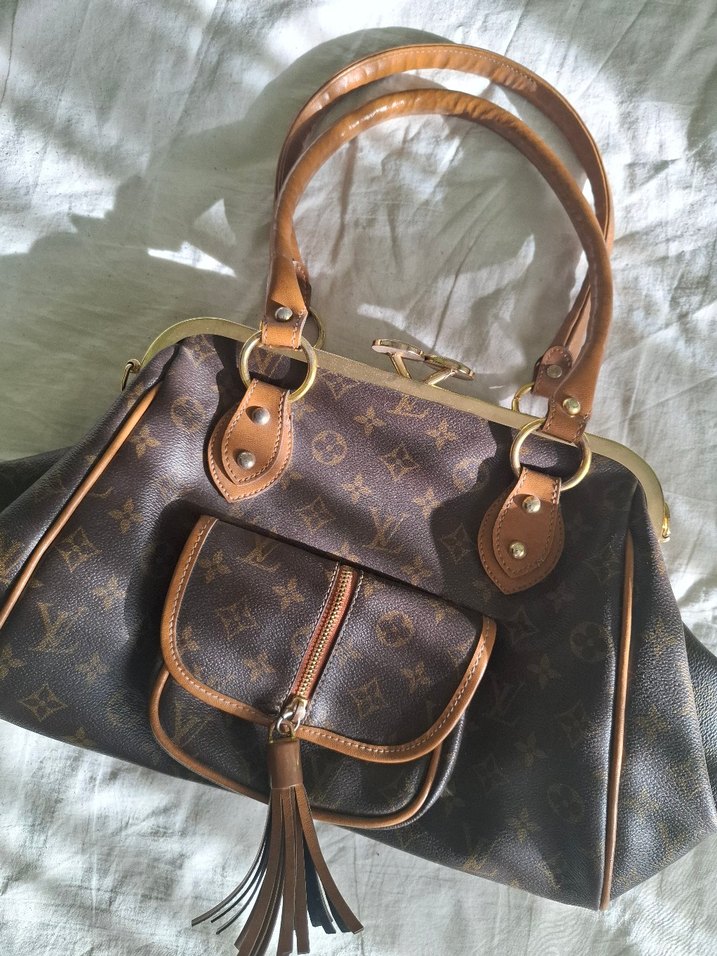 Kahverengi deseni ve tokalı detayları olan parlak deri kadın çantası. Önünde püsküllü fermuarlı cep bulunur. Modern klasik ve Paris havası taşır. Günlük kullanıma uygun.
