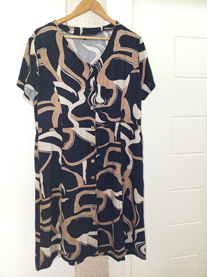 Kahverengi baskılı, kısa kollu, V yakalı midi ve bol kesim elbisedir. Ön kısmında düğmeler bulunur, çağdaş ve Paris tarzını yansıtır. Günlük kullanım için uygundur.