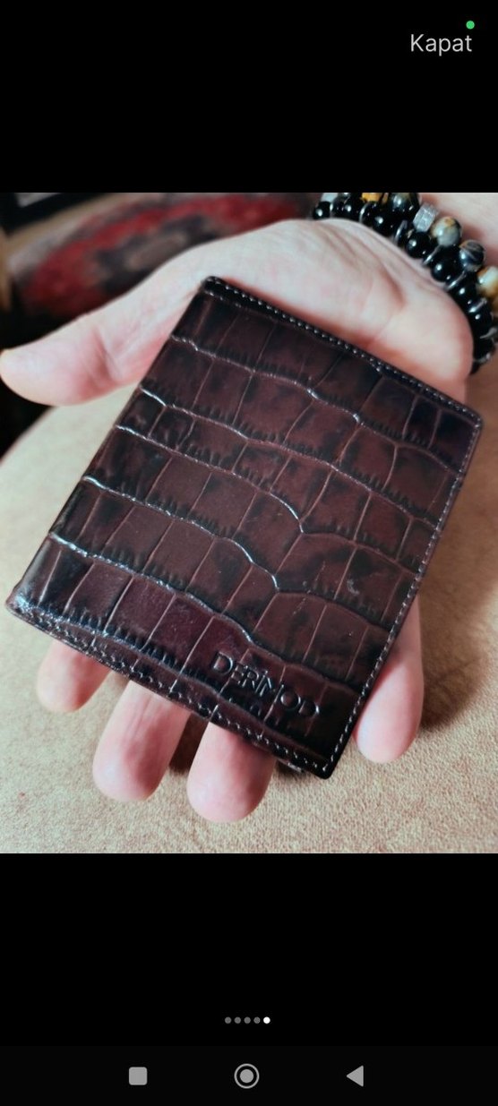 Koyu kahverengi, timsah derisi desenine benzeyen baskılı desene sahip erkek cüzdanı. Parisli karşı kültür tarzını yansıtan kompakt ve sağlam tasarım.