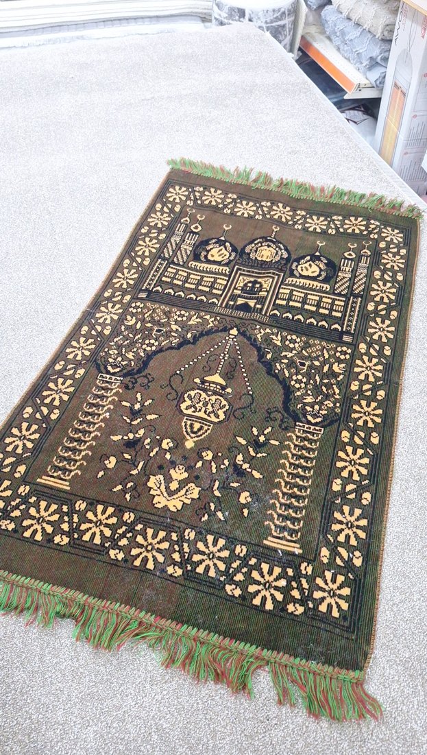 Kahverengi renkte, geleneksel desenlere sahip, ince detaylı namazlk. Kenarlarında dekoratif püsküller bulunur.