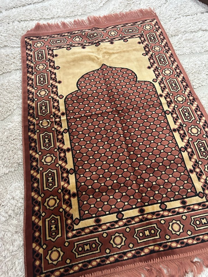 Kahverengi tonlarda desenli, ortasında kemer figürü bulunan geleneksel stil seccade , püsküllü kenarlarla tamamlanmıştır.