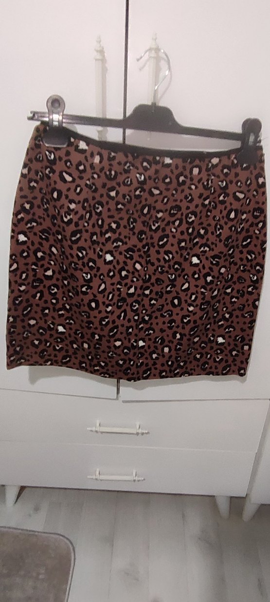 Sentetik kumaştan, kahverengi desenli, fermuarlı, normal midi boyda, dar kesim hamile eteği. Günlük kullanıma uygun grunge punk tarzında.