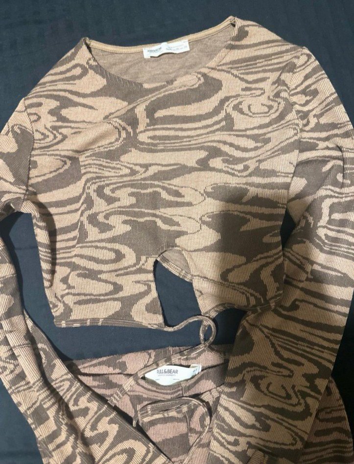 Sentetik kumaştan, uzun kollu, kahverengi desenli, kruvaze yaka ve tokalı detaylı, normal midi uzunlukta, dar kesim kadın bluz.