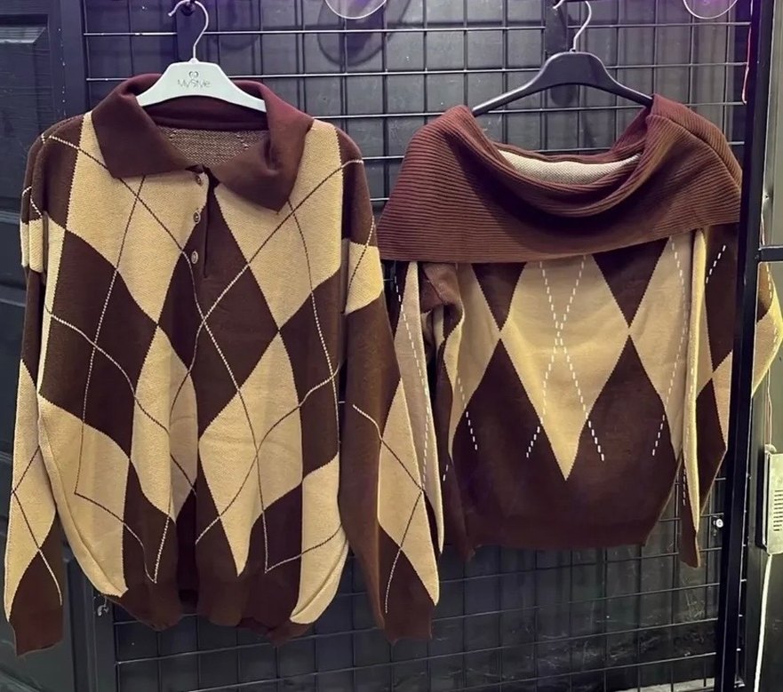 Kahverengi Desenli Kadın Triko Kazak