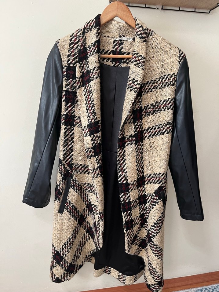 Kahverengi, desenli sentetik kumaş ve midi boy kaban. Kolları ve cep detayları deridir. Kemerin bir tarafı kahverengi desene sahipken diğer tarafı deridir.