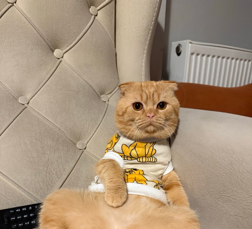 Yumuşak ve rahat kumaştan yapılmış, kahverengi desenli açık tonlarda kedi kıyafeti.