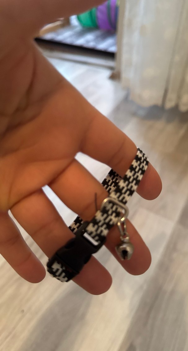 Küçük çanlı, ayarlanabilir tokalı siyah beyaz desenli kahverengi kedi tasması.