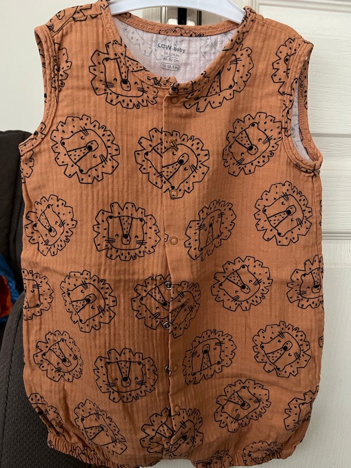 Yumuşak keten kumaştan yapılmış, kahverengi bohem desenli, kolsuz bebek tulumu. Önünde düğmeler ve askısız yaka bulunur.