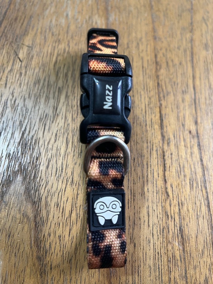 Kahverengi desenli köpek tasması, sağlam siyah toka ve metal halka içerir. Üzerinde 'Nazz' yazısı ve baykuş logosu bulunur. Optik kod: N222. Leopar desenli Medium 2 x 34 cm